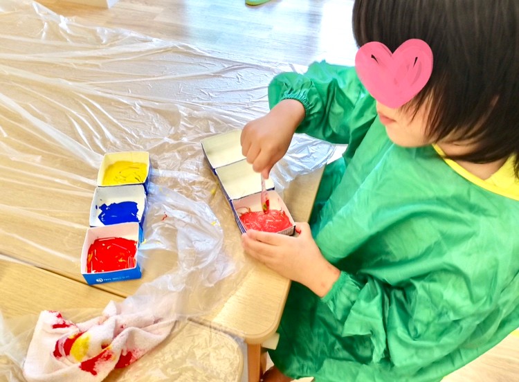 中には、「これ色違うんだよ。赤が多い方の茶色と、黄色が多い方の茶色」と絵の具の組み合わせだからこそできる色の違いを試す子も!