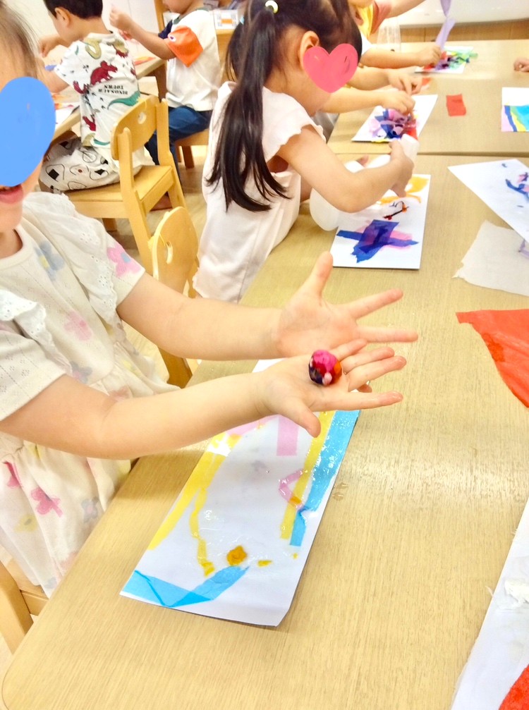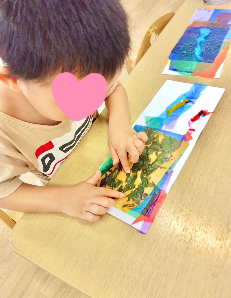 そこから上にどんどんたくさんの色のお花紙を重ねていく子、ちぎって絵を表現する子、中には水に濡れたお花紙を集めて丸めたり、粘土のように遊んだりと遊び方は無限大!