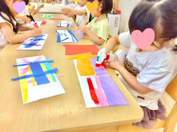 そこから上にどんどんたくさんの色のお花紙を重ねていく子、ちぎって絵を表現する子、中には水に濡れたお花紙を集めて丸めたり、粘土のように遊んだりと遊び方は無限大!