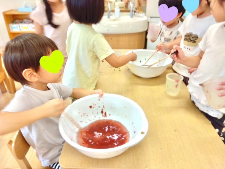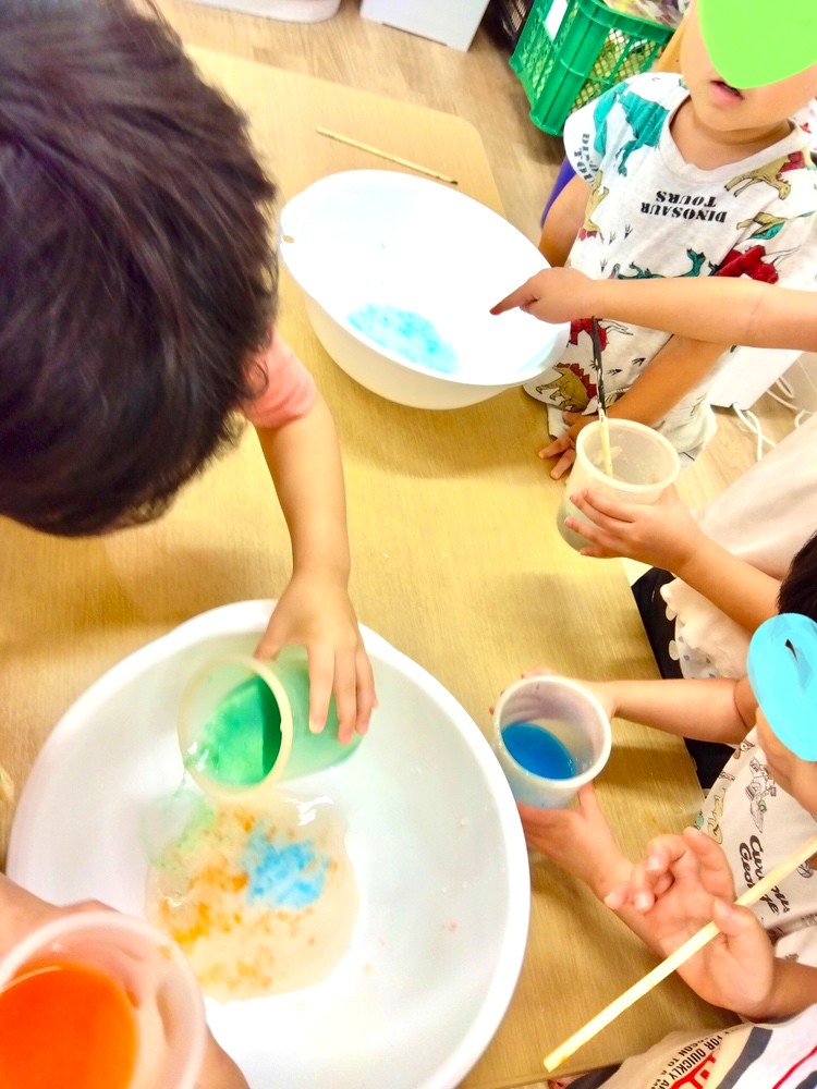 みんなで何度もぐるぐるぐるぐる・・どんどん細かくなって最後はどろどろの色水に変身しました!