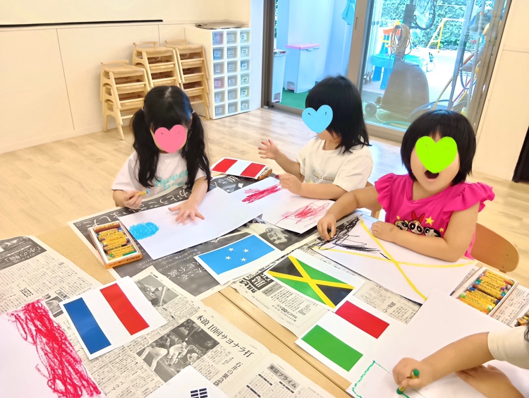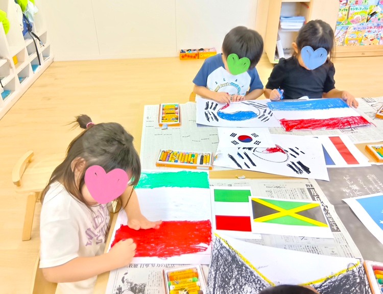 子ども達にどうやって描く?と聞くと「あるやつ真似するー!」と言うのでオリジナルの旗ではなく、国旗を真似して描くことに!
