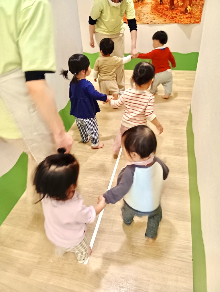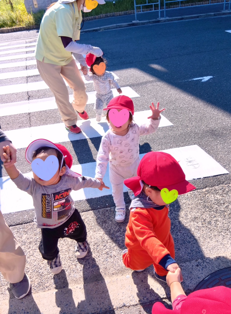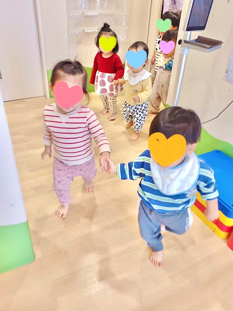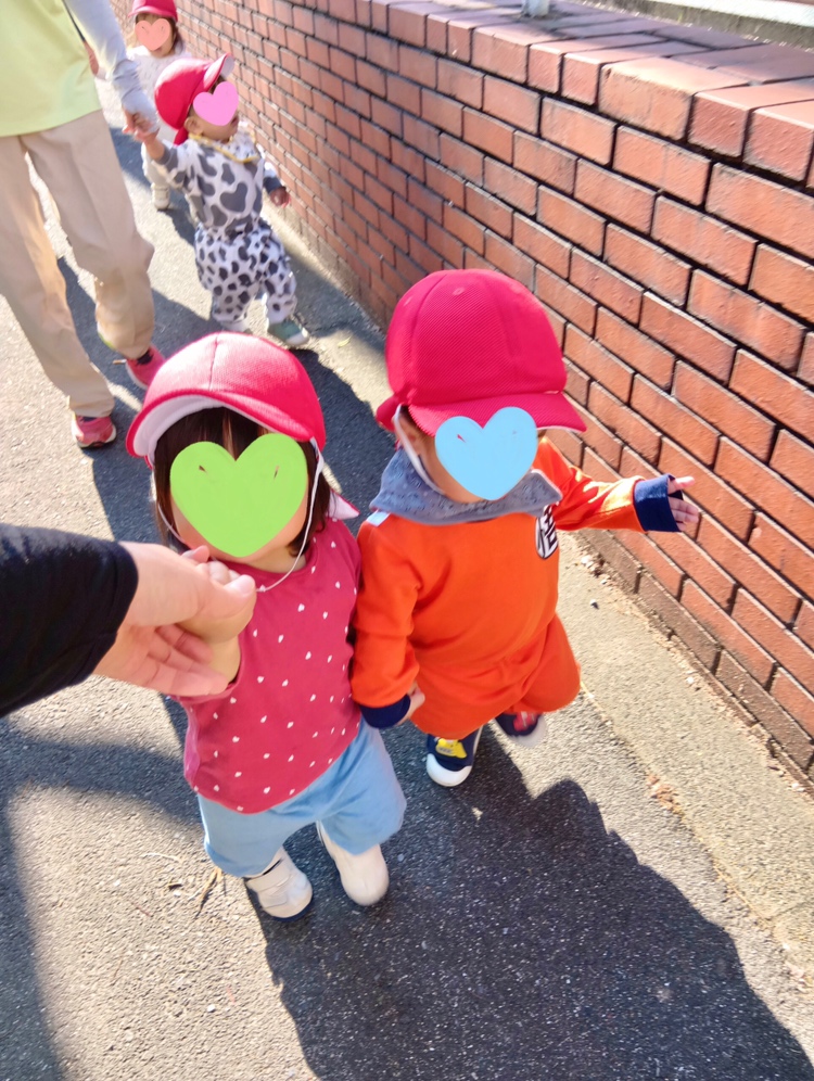 いつもは順番に保育士と一緒に手を繋いで歩いていますが、少しずつお友だち同士でも手を繋ぐ練習をしています☆