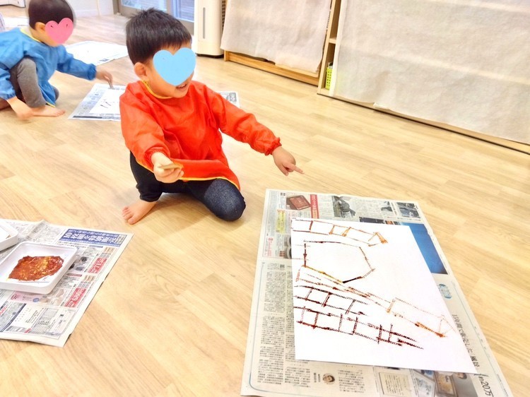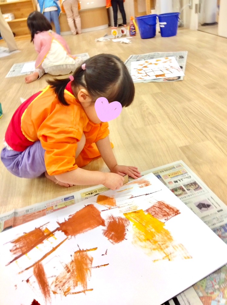 一つのダンボール片で2色の絵の具を使ったので、だんだんと色が混ざり合い、「オレンジになった!」と喜ぶ子もいました♪