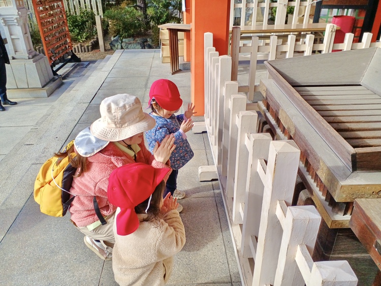神社に着くと、手を二回ぱんぱんっと合わせること、お辞儀をすることを保育士に教えてもらい、参拝しました。