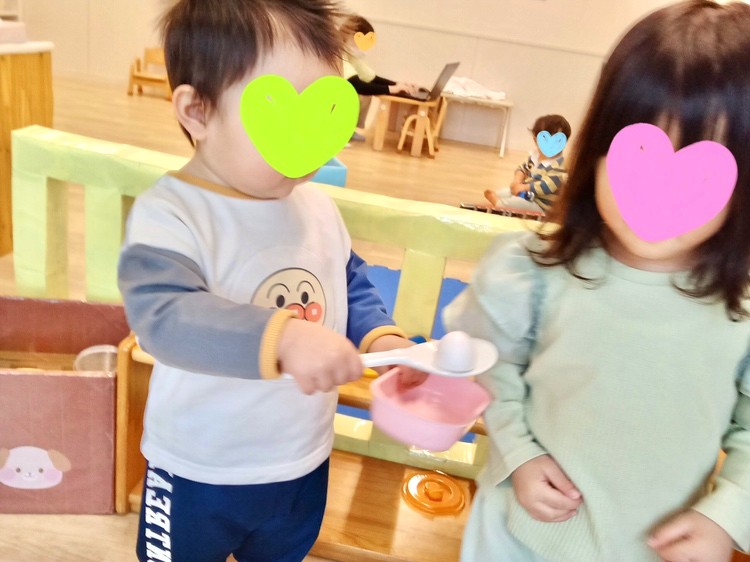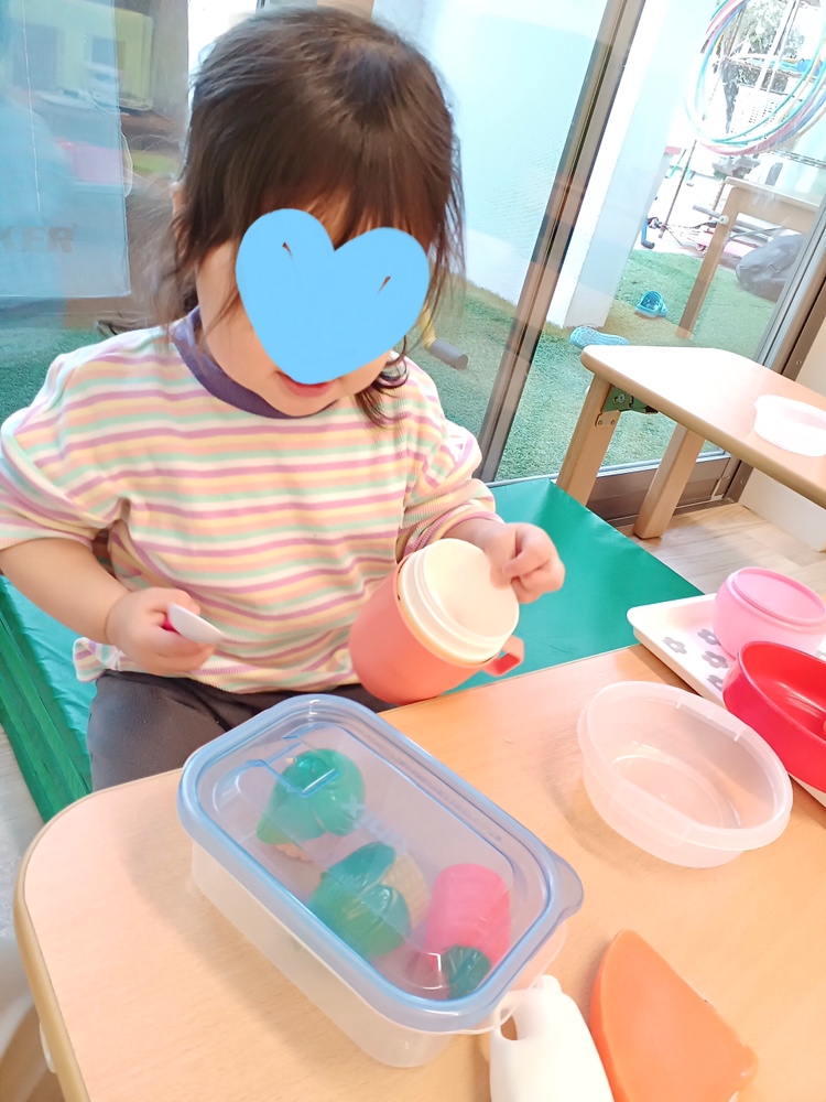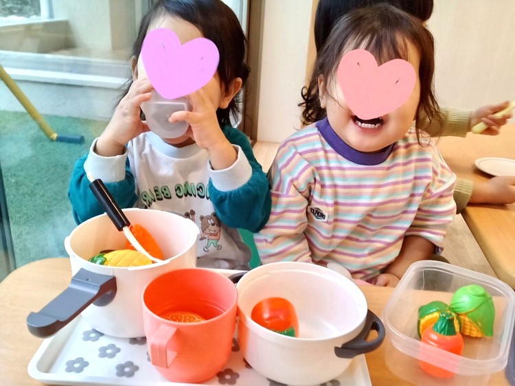 食育の時間や絵本、お家で保護者の方がお料理をするところを見て、段々とトングで食べ物を掴んで盛り付けたり、キッチンのコンロの上でフライパンで炒め物をする真似をしたりと、ごっこ遊びにも成長が見られるようになりました(^^)