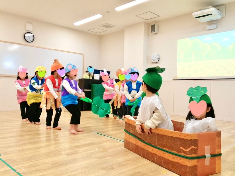特に劇遊びでは『もりのなかまとおおきなかぶ』というお話でみんなで「うんとこしょ、どっこいしょ!」と力を合わせて引っ張っていましたよ♪