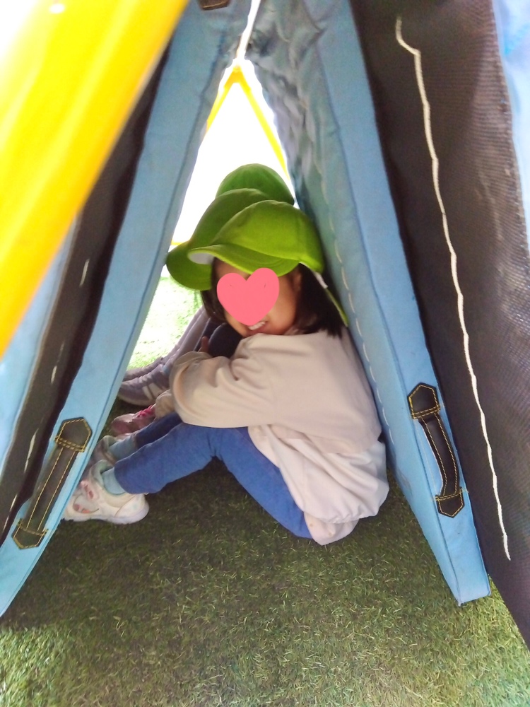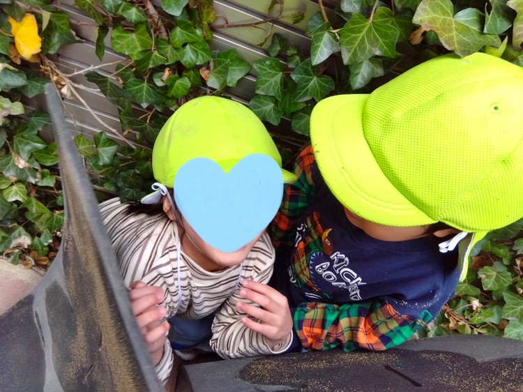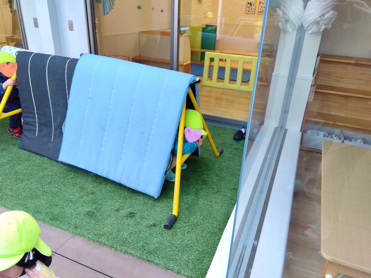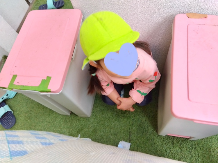 と思っていましたが、ごみ箱を並べた後ろや砂場のマットを立てかけた後ろなどなど工夫次第にたくさんの隠れ場所が!